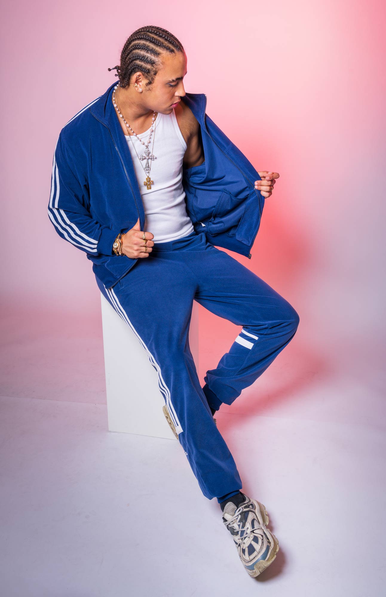 The nineties were textured and imperfect. Denim softened with wear. Tracksuits moved from sportswear to everyday armor. Jewelry caught light in rooms shaped by music and late hours.